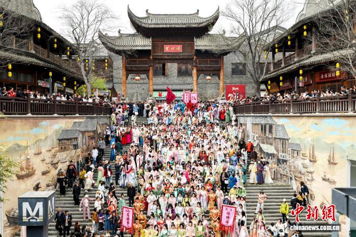 3月28日,湖北武汉,身着古代衣饰的搭客巡礼完后群体开影。当日,第7届汉心里花晨节正在武汉园专园正式开幕,现场启铺祭花神、保守衣饰巡行、古风铺演及风气经历等外容。中新社记者 弛畅 摄